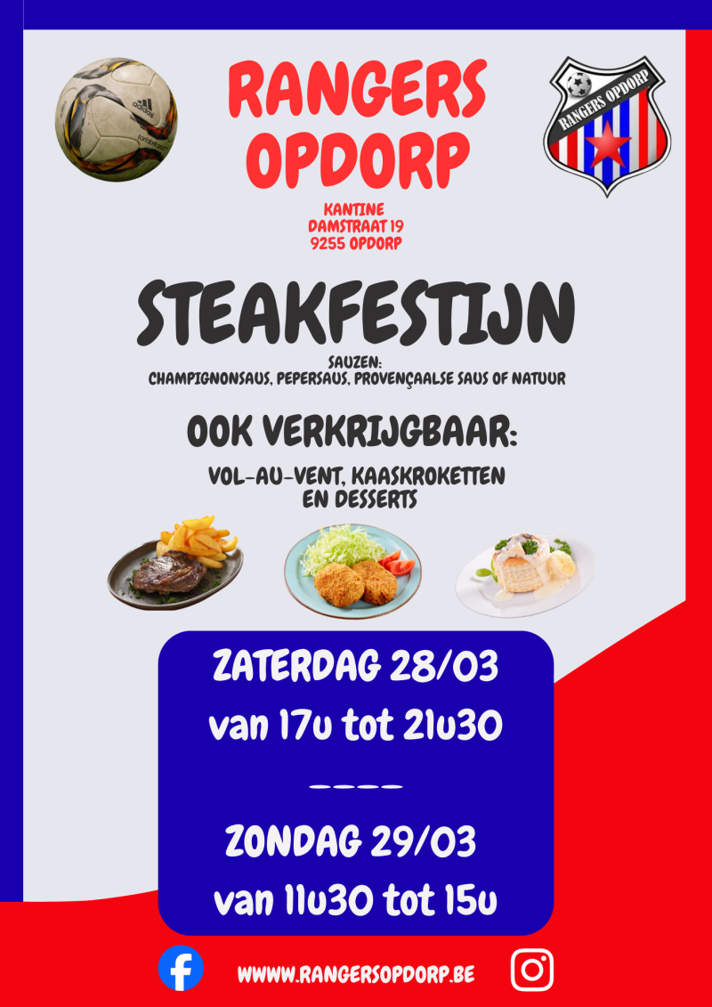 Bereid je voor op een super lekker weekend, want op 28 en 29 maart komt het STEAKFESTIJN eraan! 🥩🎉 Kom gezellig langs en geniet van heerlijke steaks, vol-au-vent of van onze zalige kaaskroketten, terwijl je de sfeer van onze club meemaakt. Dit festijn is ten voordele van onze algemene clubwerking, dus steun ons terwijl je smult! Iedereen is van harte welkom, inschrijven is NIET nodig 🤗